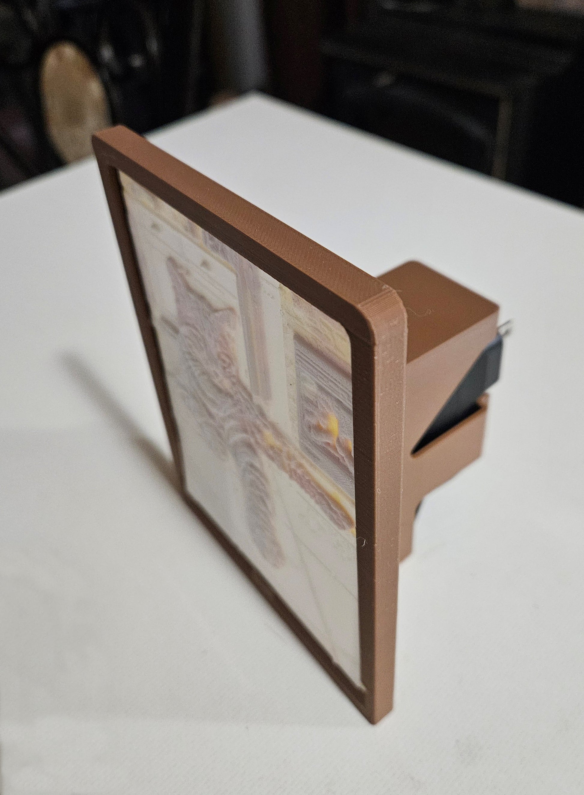 Can be used with the wire coiled up in the frame and plugged directly into a standard wall outlet. Note* works best in newer outlets. Some older highly used outlets, are worn and the display may lean forward.