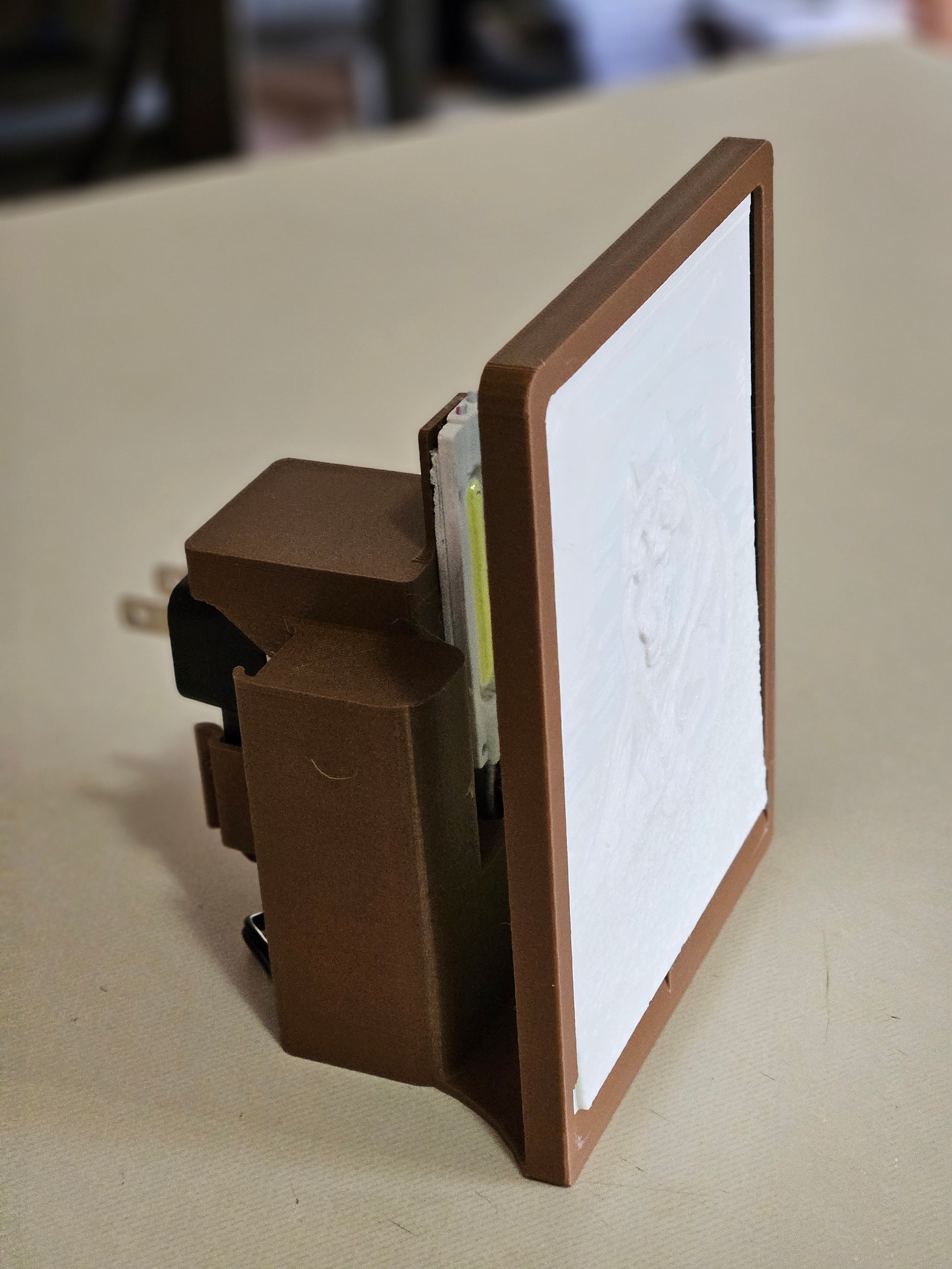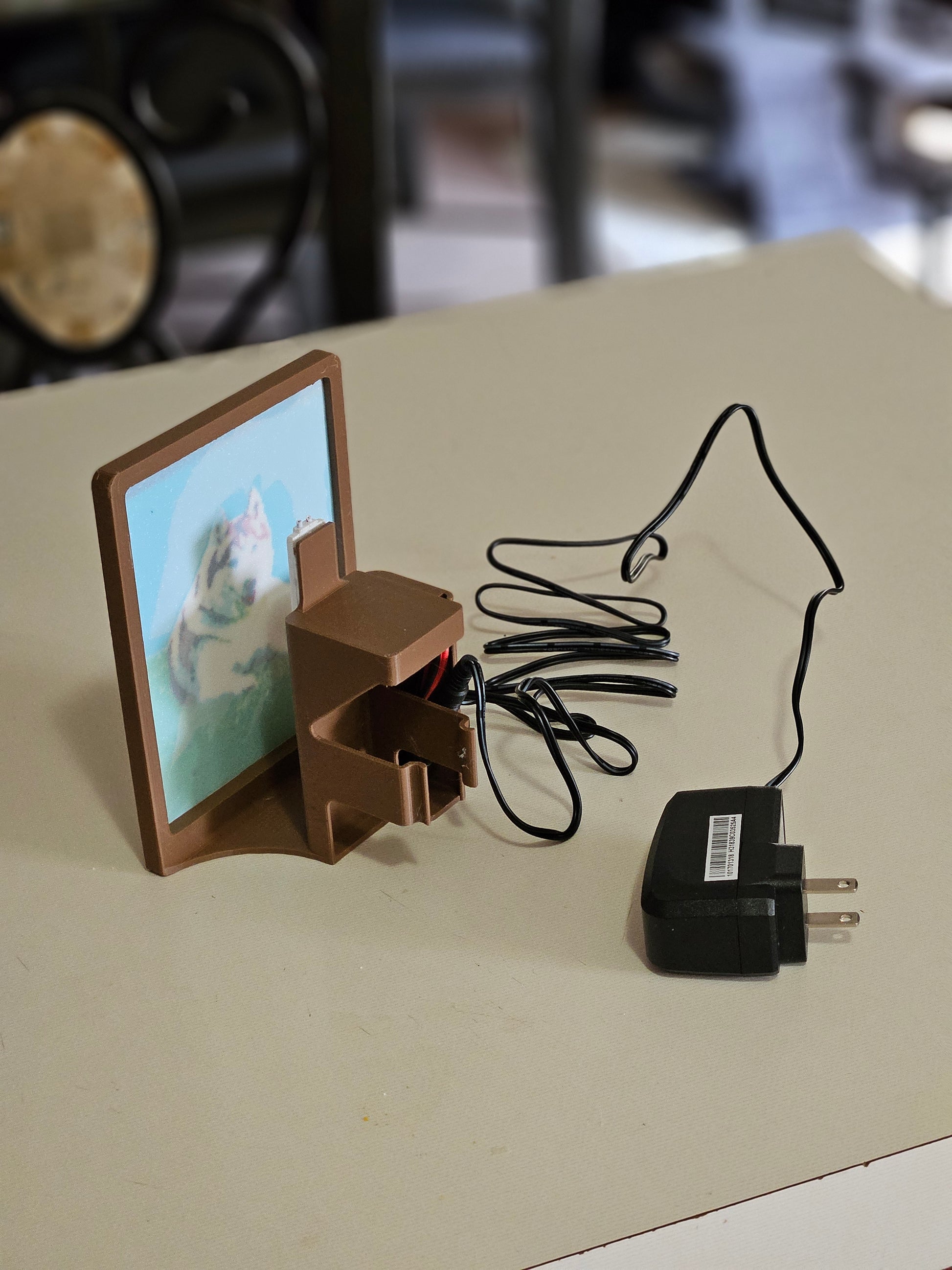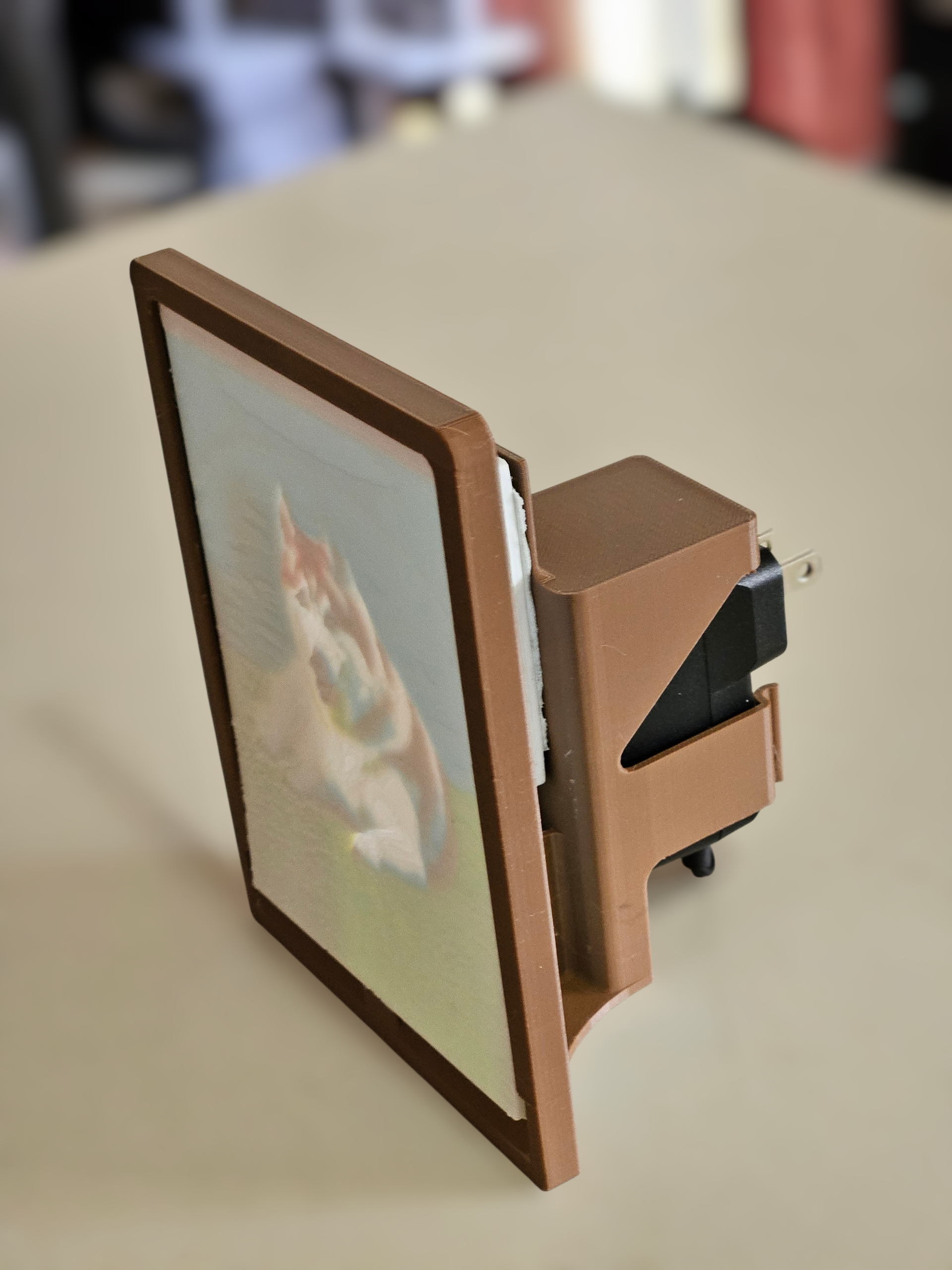 Can be used with the wire coiled up in the frame and plugged directly into a standard wall outlet. Note* works best in newer outlets. Some older highly used outlets, are worn and the display may lean forward.