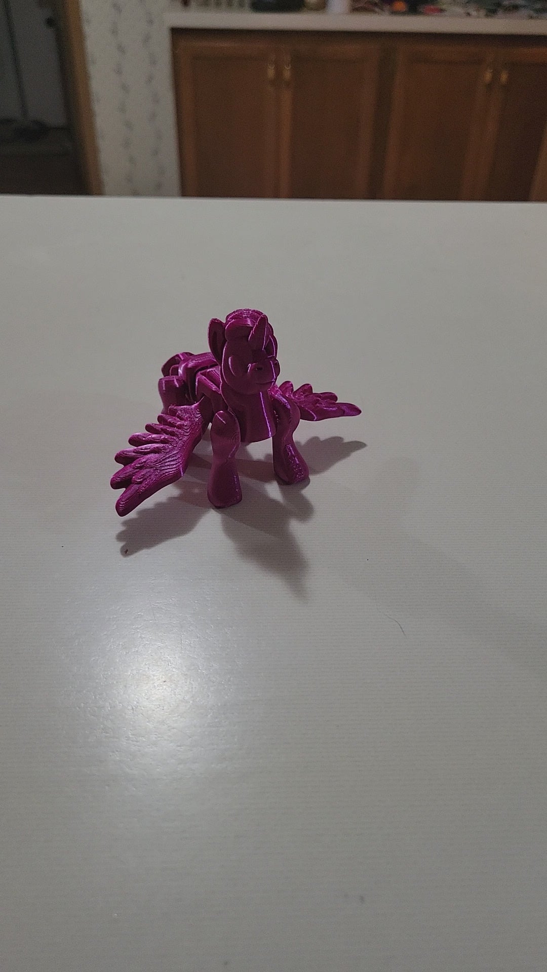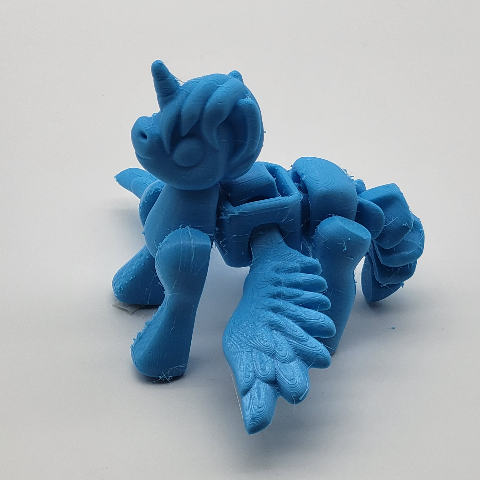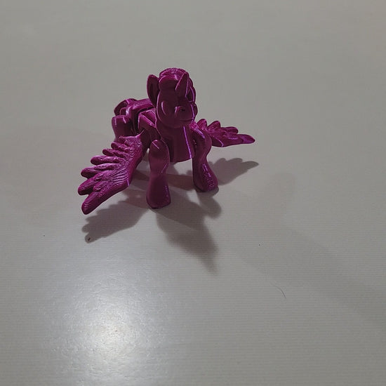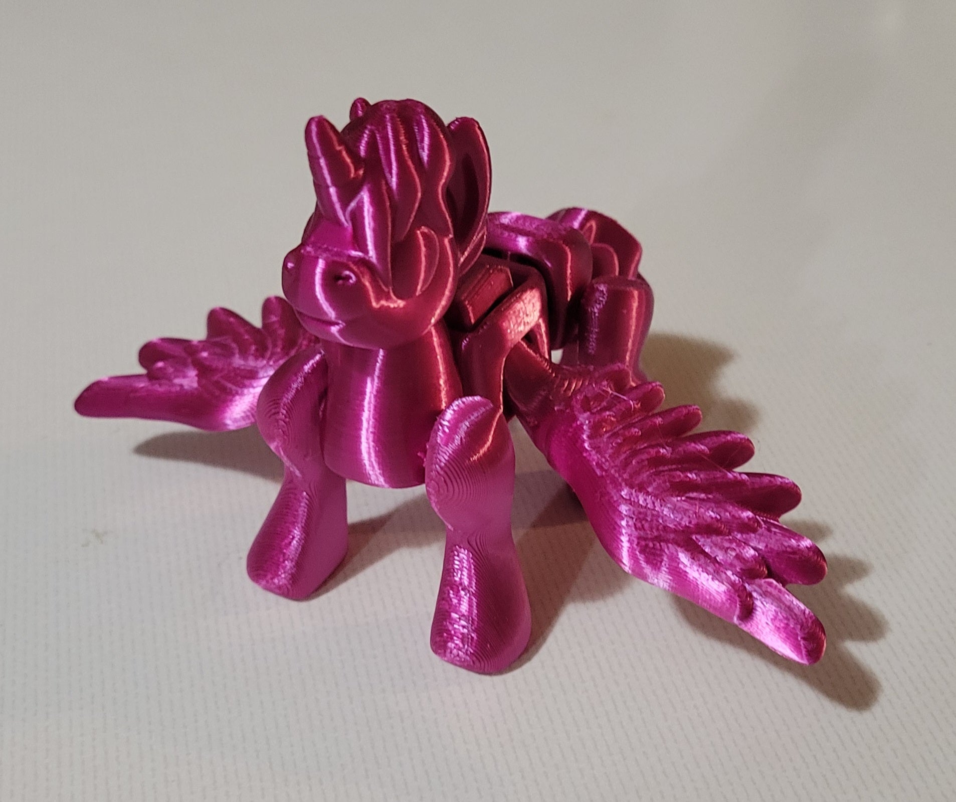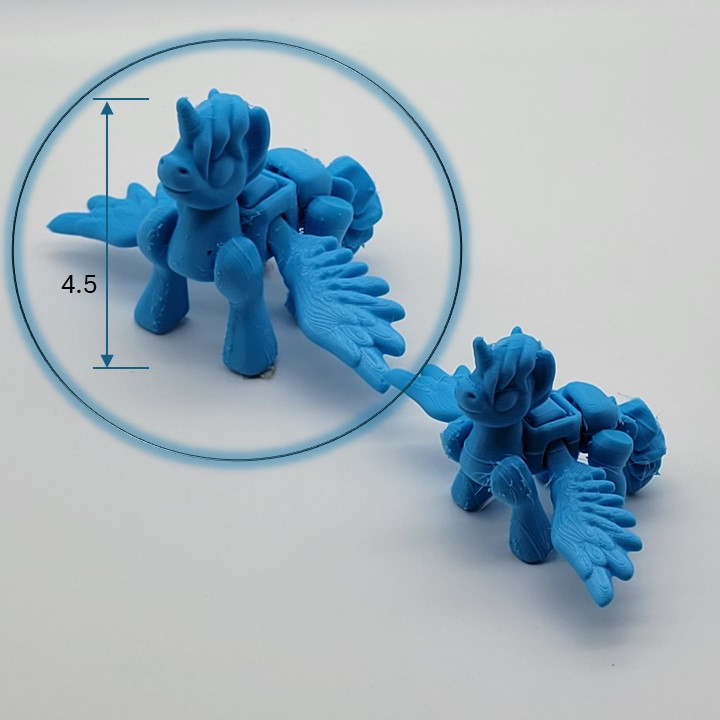 3D printed Unicorn is 4.5n tall 4.5 in long and 7 in wingspan. It is flexible, poseable and it flaps its wings when you press a button repeatedly.